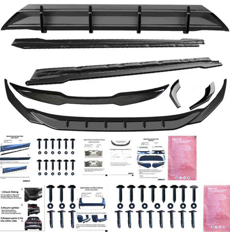 De set bestaat uit: voorspoiler, achterspoiler, sideskirts, diffuser, achtersplitters